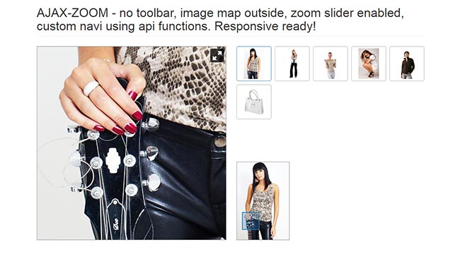 Image map: unlike in most other examples the image map is positioned outside of AJAX-ZOOM player. This can be done with the option "mapParent" in /axZm/zoomConfig.inc.php or zoomConfigCustom.inc.php; "mapParent" defines the ID of a block element e.g. a DIV on the page. The map fits inside the responsive parent container difined by "mapParent" option, in this example directly over JS in onBeforeStart callback as jQuery.axZm.mapParent = 'mapContainer'; you can also place the AJAX-ZOOM "image map" over / in place of selected thumbnail. In this particular layout we have chose to hide AJAX-ZOOM "image map" on small screens (below 991px) over @media CSS rule.